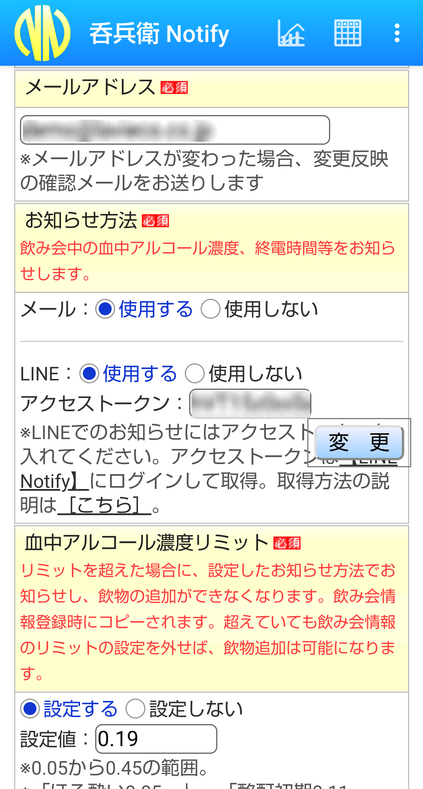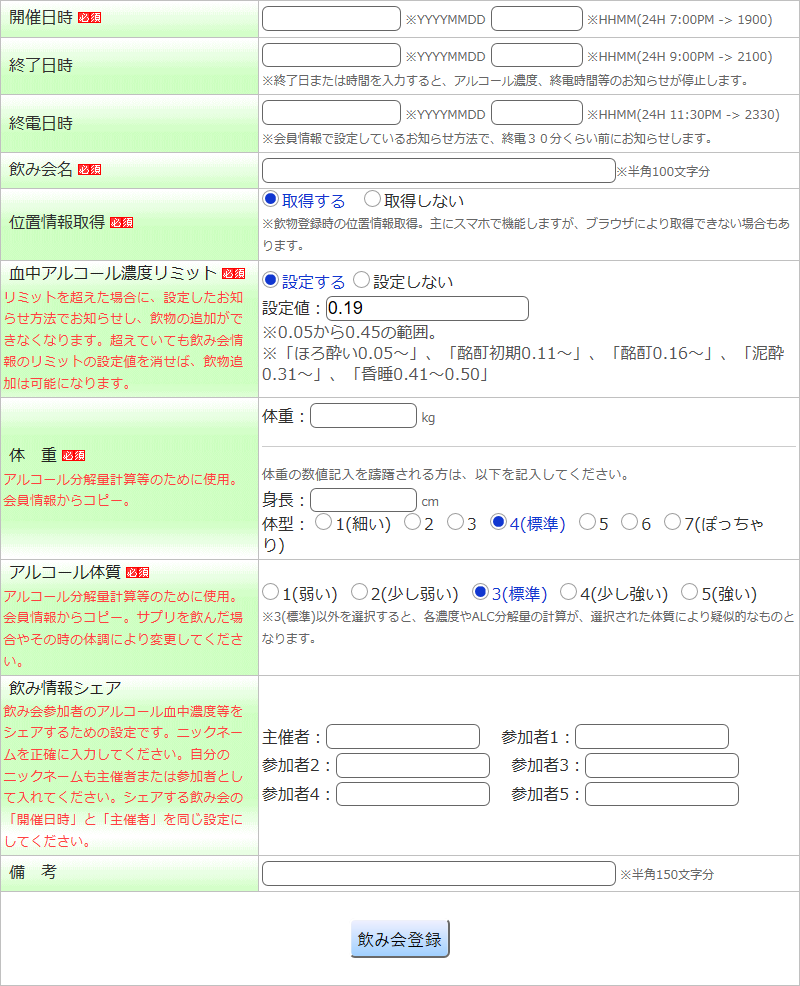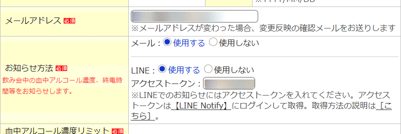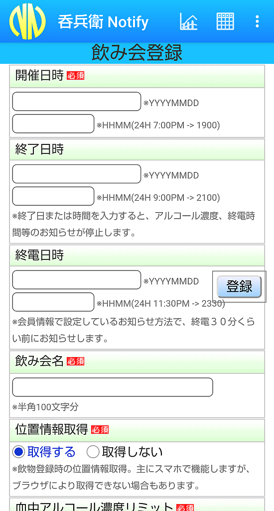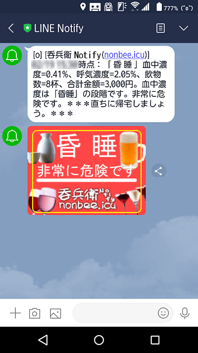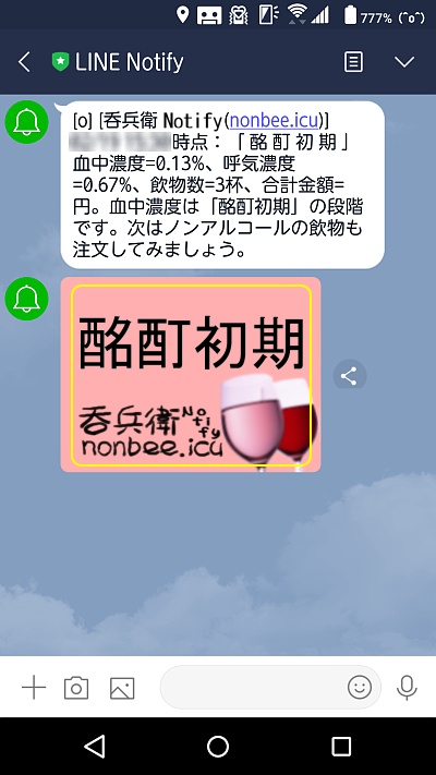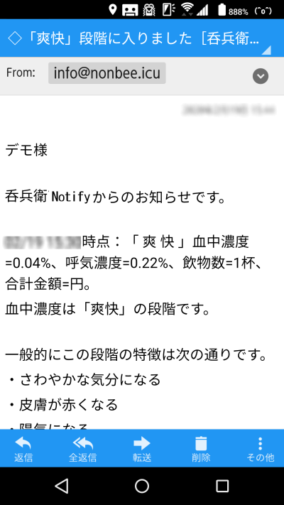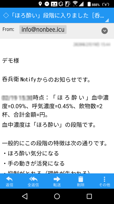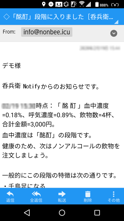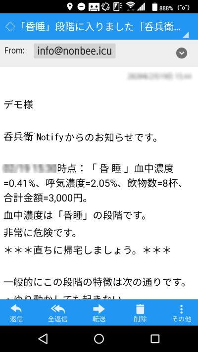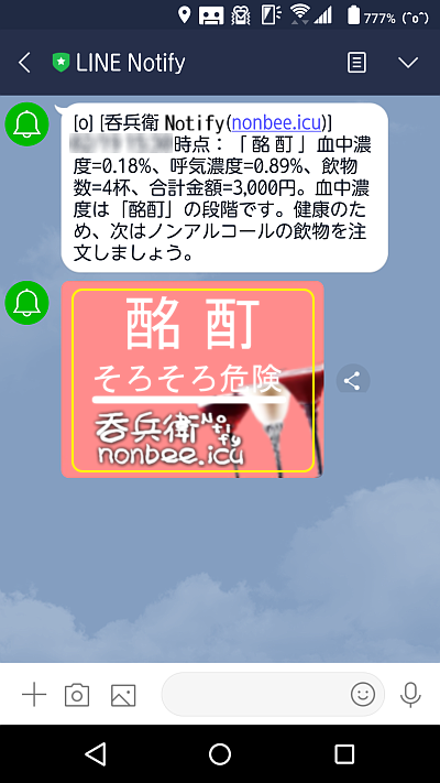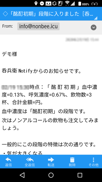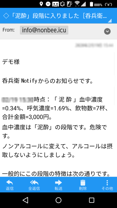 呑兵衛 Notify(のんべえノーティファイ)は、摂取するお酒を飲物ごとに登録していくことで、血中アルコール濃度がどの段階にあるかを「グラフ」や「お知らせ」で分かるようになっています。血中アルコール濃度は、飲まれる方の体重や時間の経過で濃度が変わってきます。その濃度により「ほろ酔い」や「酩酊初期」、「酩酊」などの段階があり、その段階が上がるたびにあらかじめ設定したお知らせの方法(メール)で段階のお知らせをお送りします。 また、その他のお知らせの種類として、「終電時間のお知らせ」、「血中アルコール濃度リミットのお知らせ」があります。「終電時間のお知らせ」では、終電の時間を登録しておくことで、約30分前にお知らせをお送りします。「血中アルコール濃度リミットのお知らせ」は、アルコールの濃度がリミットとして設定した値に達した場合にお知らせをお送りし、そのあとの飲物の追加をできないようにしてリミットに達したことをより分かりやすくしています。 血中アルコール濃度が同じ値であっても、人によってアルコールへの体質の違いがあったり、飲む時の体調により酔い方が違うこともあります。そういった場合や、アルコール分解のサプリを飲んだときなどには、会員情報や飲み会情報を登録する際の「アルコール体質」を変えることで、疑似的に濃度を変えてお知らせ等に適用することができます。 飲物の登録では、ショットごとに代金を支払う場合に便利なように飲物単位の酒代の登録が行えます。飲み会で最後に清算の場合は、最後に注文した飲物情報にあとでその酒代を登録できます。1次会や2次会など、清算するたびに登録しておけば、その日の飲み会の合計金額がいくらであったかが飲み会一覧で見ることができます。カレンダーでは、月単位でのサマリーが表示され、月の酒代の合計や飲み会の回数などが表示されます。 詳しくは以下をご覧ください。