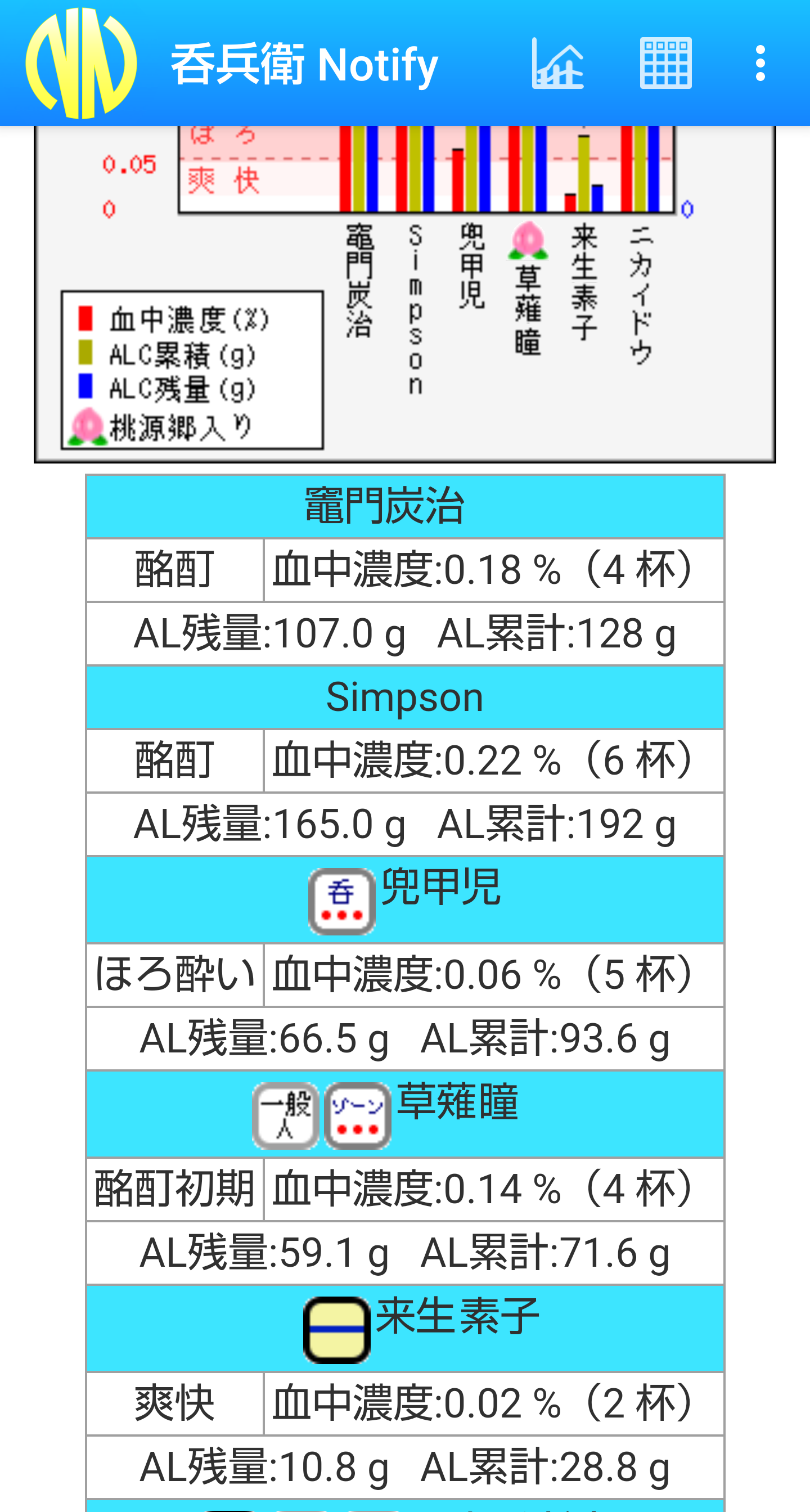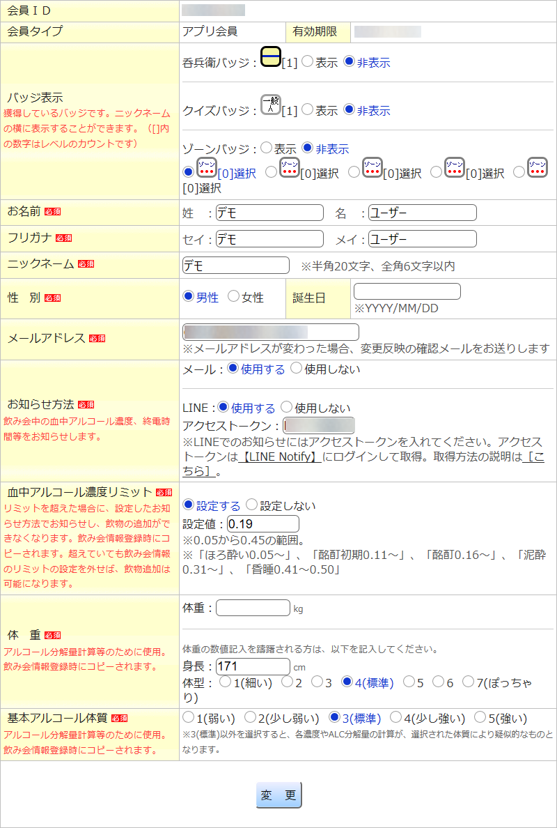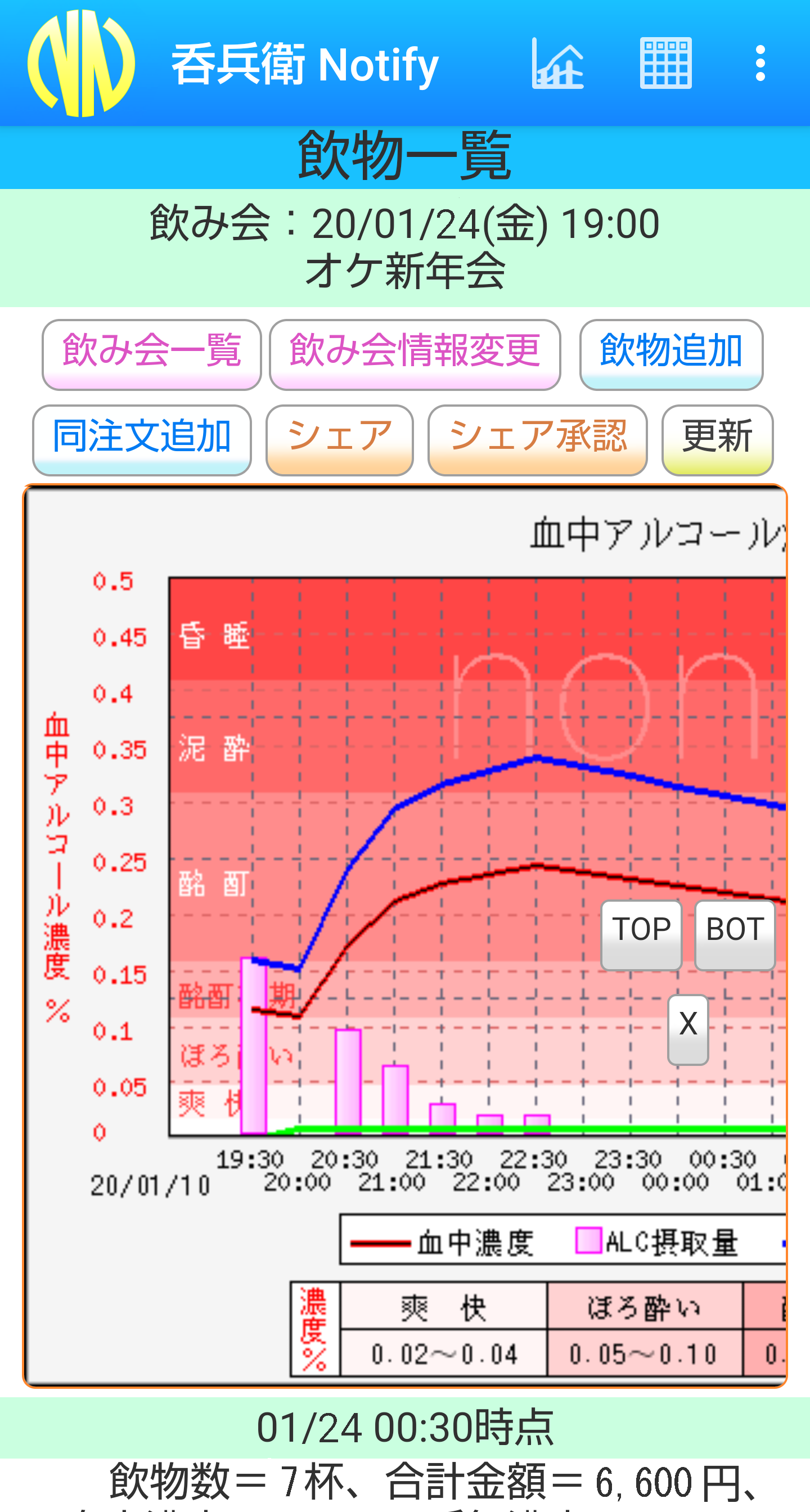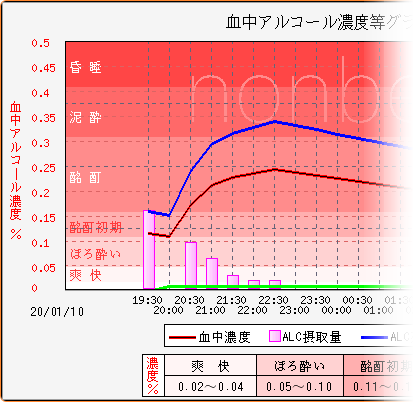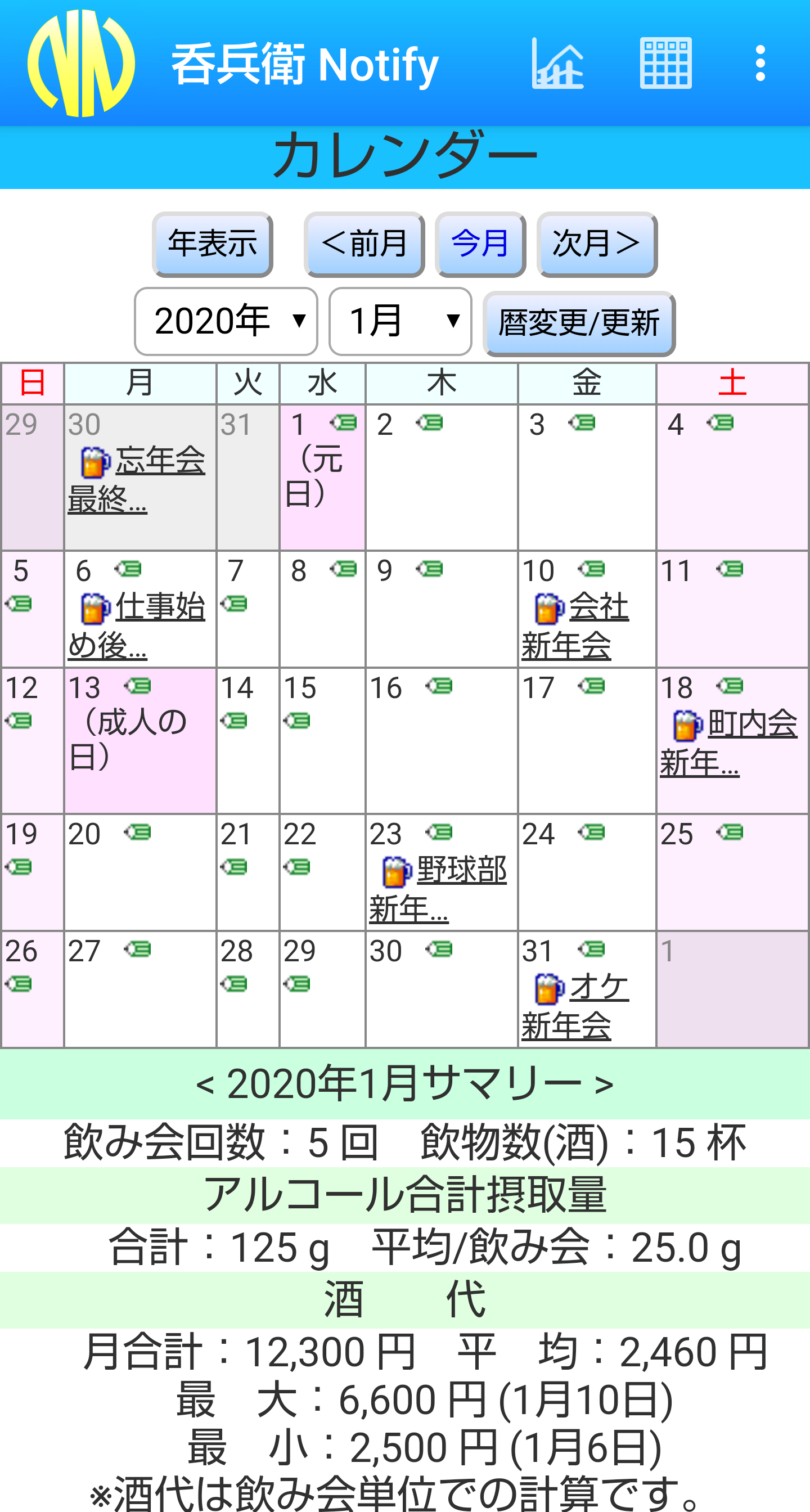 呑兵衛 Notify(のんべえノーティファイ)は、摂取するお酒を飲物ごとに登録していくことで、血中アルコール濃度がどの段階にあるかを「グラフ」や「お知らせ」で分かるようになっています。血中アルコール濃度は、飲まれる方の体重や時間の経過で濃度が変わってきます。その濃度により「ほろ酔い」や「酩酊初期」、「酩酊」などの段階があり、その段階が上がるたびにあらかじめ設定したお知らせの方法(メール)で段階のお知らせをお送りします。 また、その他のお知らせの種類として、「終電時間のお知らせ」、「血中アルコール濃度リミットのお知らせ」があります。「終電時間のお知らせ」では、終電の時間を登録しておくことで、約30分前にお知らせをお送りします。「血中アルコール濃度リミットのお知らせ」は、アルコールの濃度がリミットとして設定した値に達した場合にお知らせをお送りし、そのあとの飲物の追加をできないようにしてリミットに達したことをより分かりやすくしています。 血中アルコール濃度が同じ値であっても、人によってアルコールへの体質の違いがあったり、飲む時の体調により酔い方が違うこともあります。そういった場合や、アルコール分解のサプリを飲んだときなどには、会員情報や飲み会情報を登録する際の「アルコール体質」を変えることで、疑似的に濃度を変えてお知らせ等に適用することができます。 飲物の登録では、ショットごとに代金を支払う場合に便利なように飲物単位の酒代の登録が行えます。飲み会で最後に清算の場合は、最後に注文した飲物情報にあとでその酒代を登録できます。1次会や2次会など、清算するたびに登録しておけば、その日の飲み会の合計金額がいくらであったかが飲み会一覧で見ることができます。カレンダーでは、月単位でのサマリーが表示され、月の酒代の合計や飲み会の回数などが表示されます。 詳しくは以下をご覧ください。