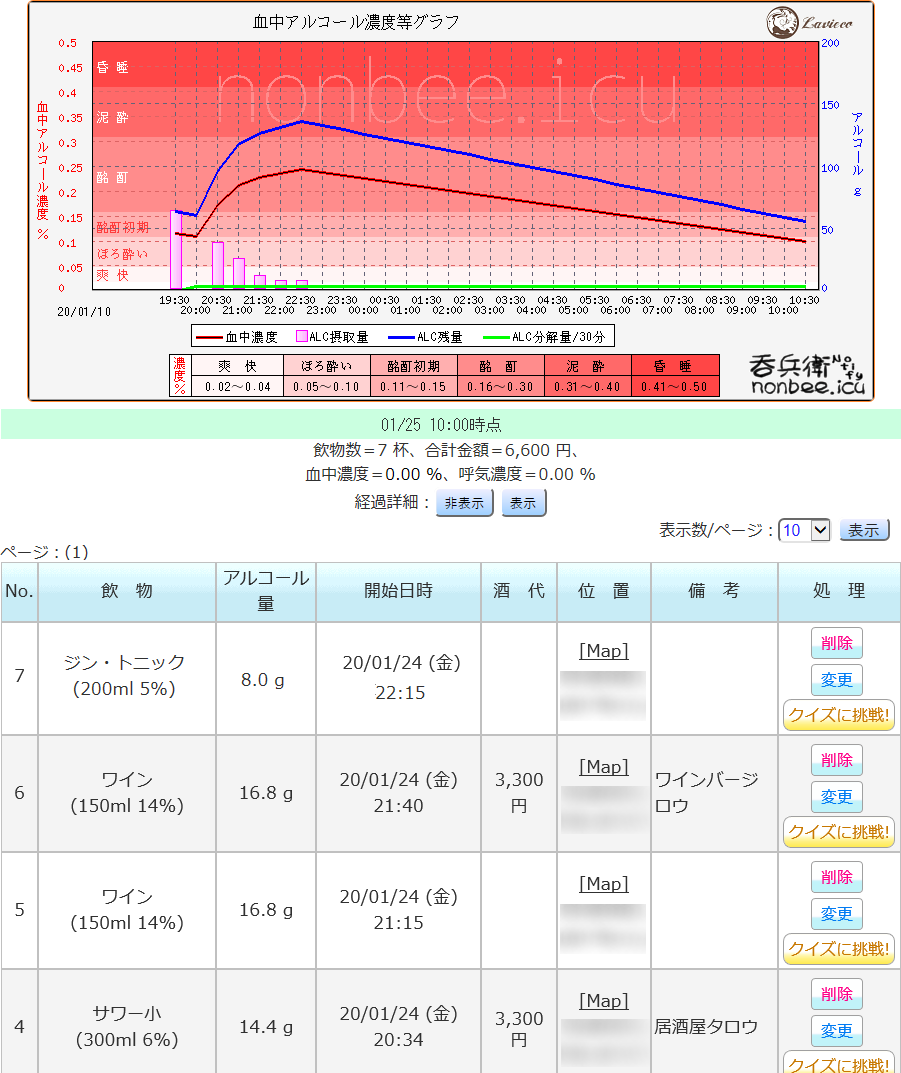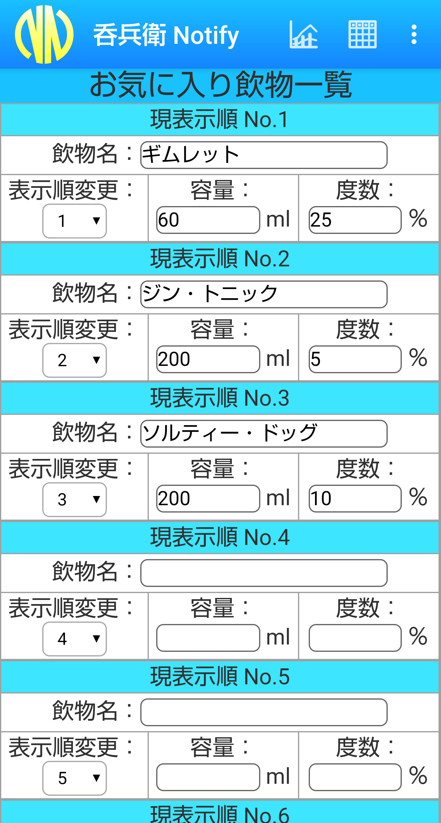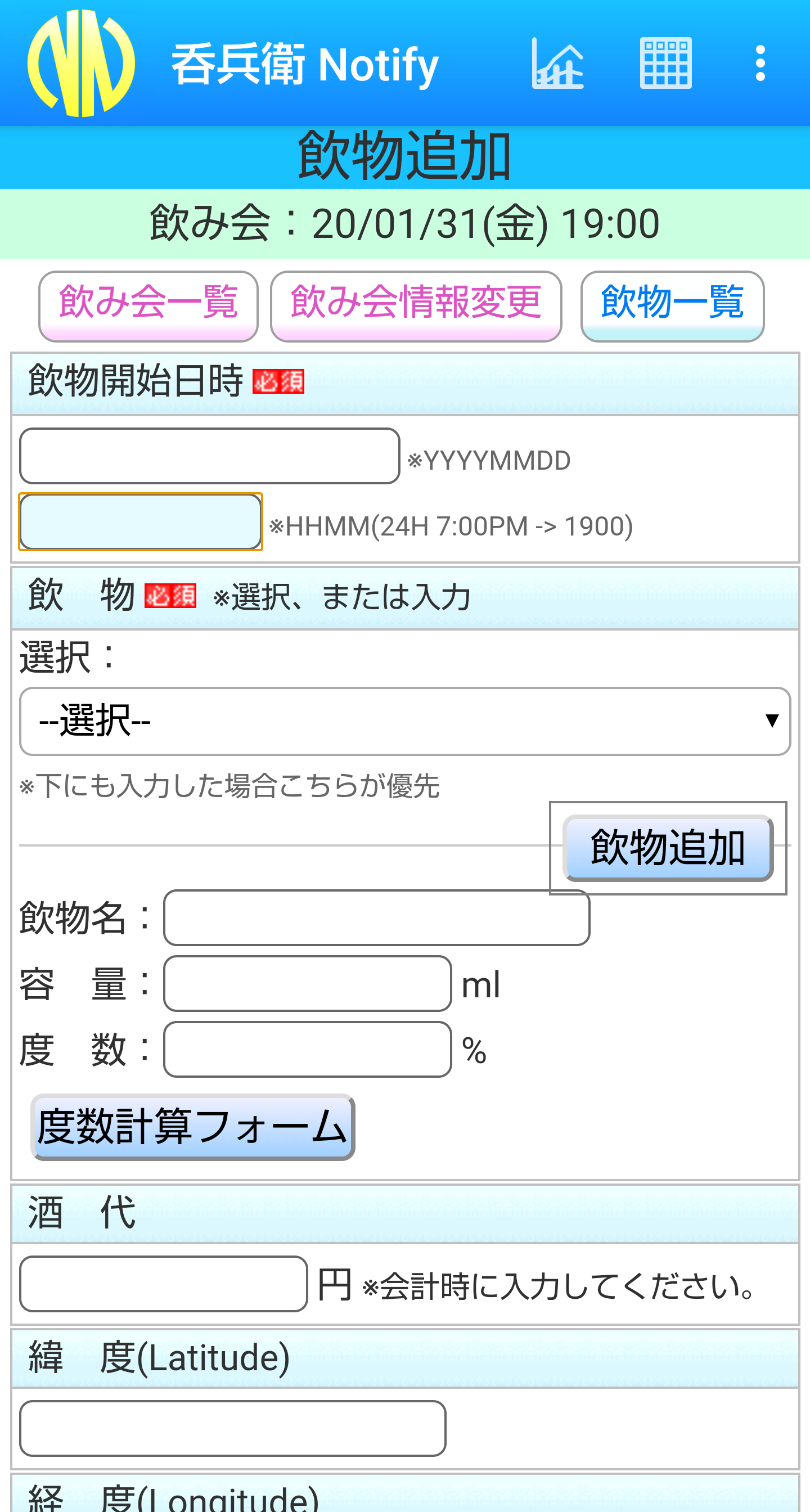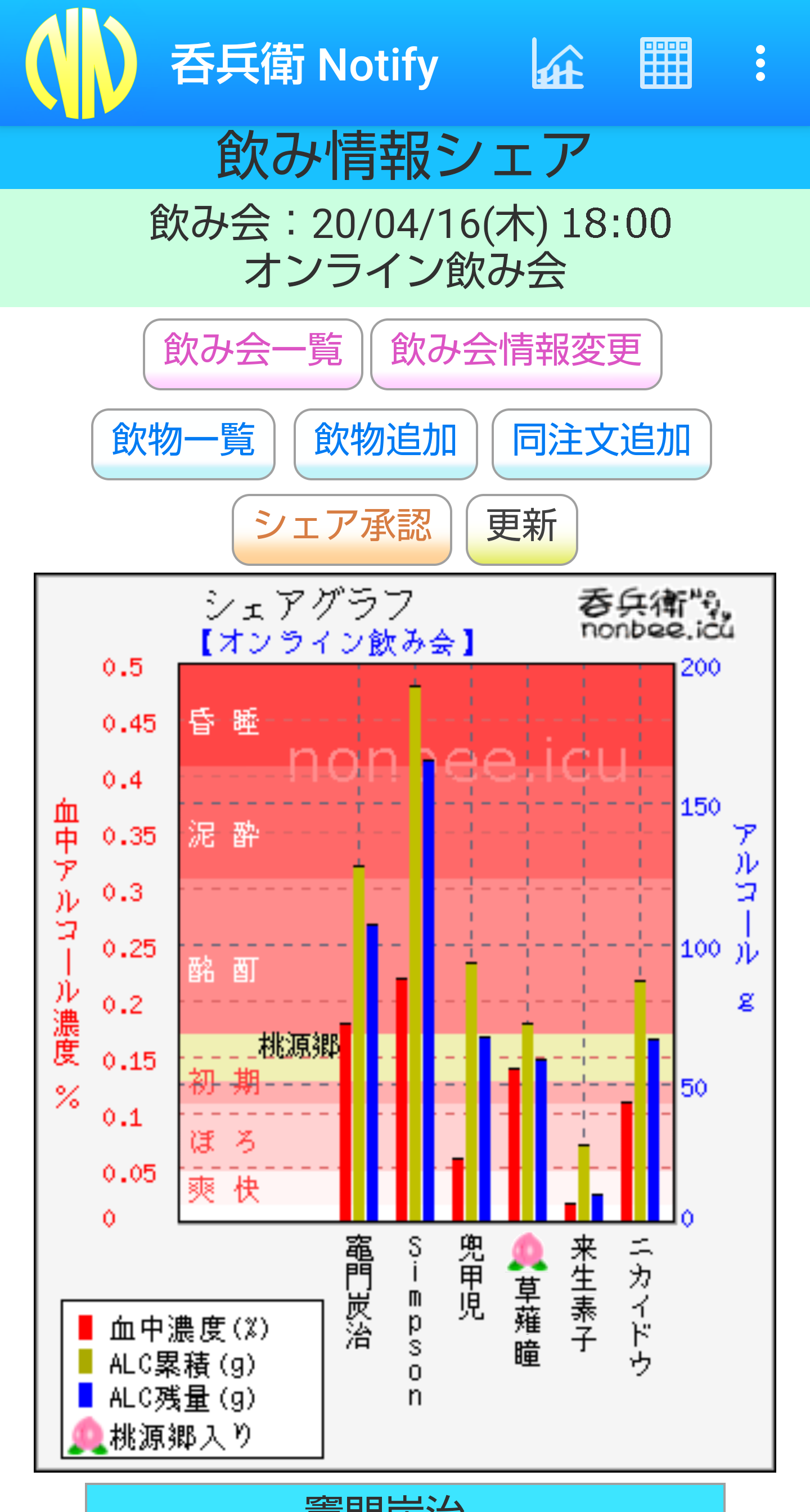 呑兵衛 Notify(のんべえノーティファイ)は、摂取するお酒を飲物ごとに登録していくことで、血中アルコール濃度がどの段階にあるかを「グラフ」や「お知らせ」で分かるようになっています。血中アルコール濃度は、飲まれる方の体重や時間の経過で濃度が変わってきます。その濃度により「ほろ酔い」や「酩酊初期」、「酩酊」などの段階があり、その段階が上がるたびにあらかじめ設定したお知らせの方法(メール)で段階のお知らせをお送りします。 また、その他のお知らせの種類として、「終電時間のお知らせ」、「血中アルコール濃度リミットのお知らせ」があります。「終電時間のお知らせ」では、終電の時間を登録しておくことで、約30分前にお知らせをお送りします。「血中アルコール濃度リミットのお知らせ」は、アルコールの濃度がリミットとして設定した値に達した場合にお知らせをお送りし、そのあとの飲物の追加をできないようにしてリミットに達したことをより分かりやすくしています。 血中アルコール濃度が同じ値であっても、人によってアルコールへの体質の違いがあったり、飲む時の体調により酔い方が違うこともあります。そういった場合や、アルコール分解のサプリを飲んだときなどには、会員情報や飲み会情報を登録する際の「アルコール体質」を変えることで、疑似的に濃度を変えてお知らせ等に適用することができます。 飲物の登録では、ショットごとに代金を支払う場合に便利なように飲物単位の酒代の登録が行えます。飲み会で最後に清算の場合は、最後に注文した飲物情報にあとでその酒代を登録できます。1次会や2次会など、清算するたびに登録しておけば、その日の飲み会の合計金額がいくらであったかが飲み会一覧で見ることができます。カレンダーでは、月単位でのサマリーが表示され、月の酒代の合計や飲み会の回数などが表示されます。 詳しくは以下をご覧ください。