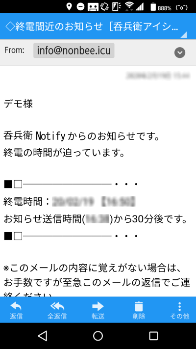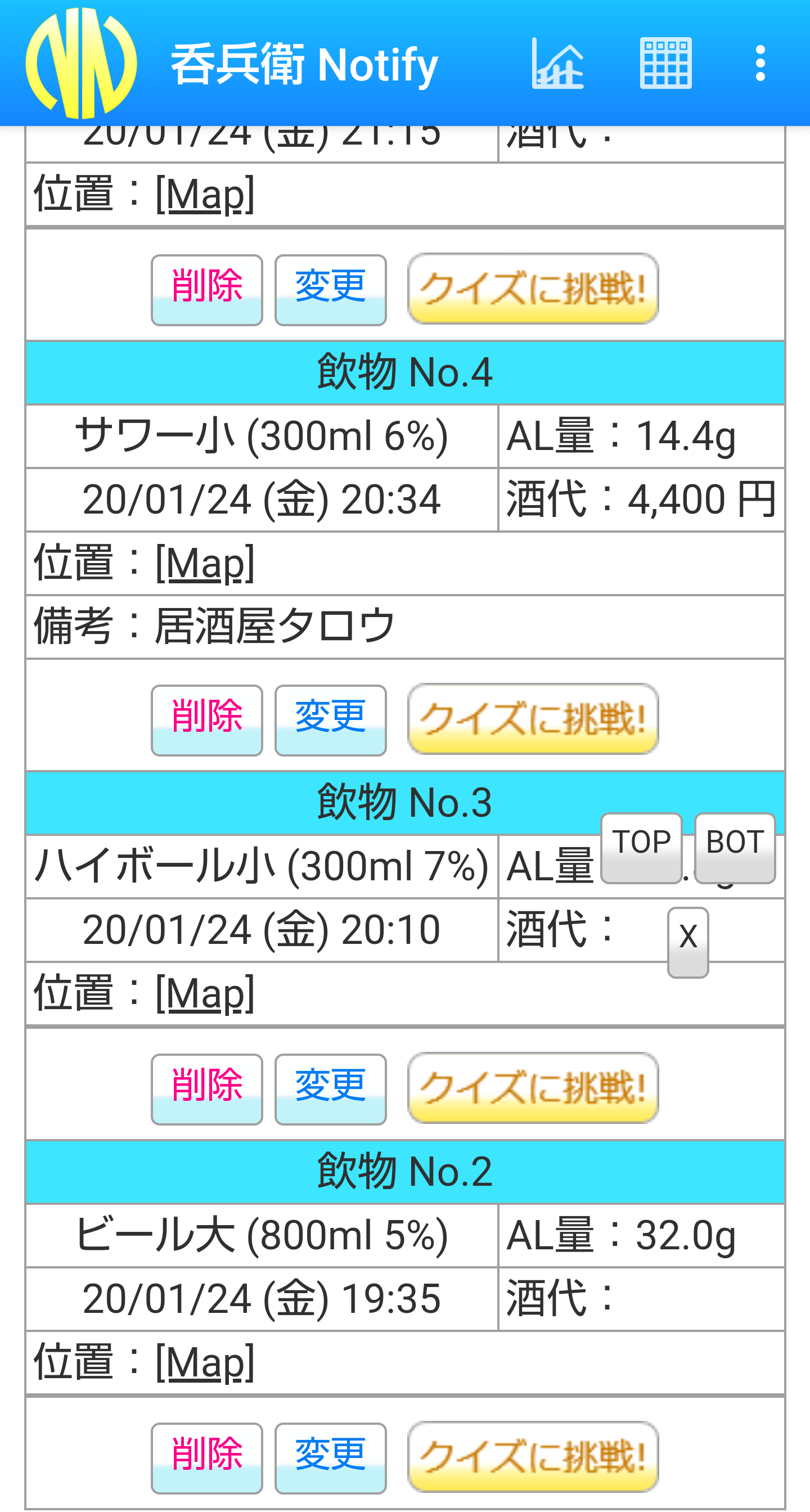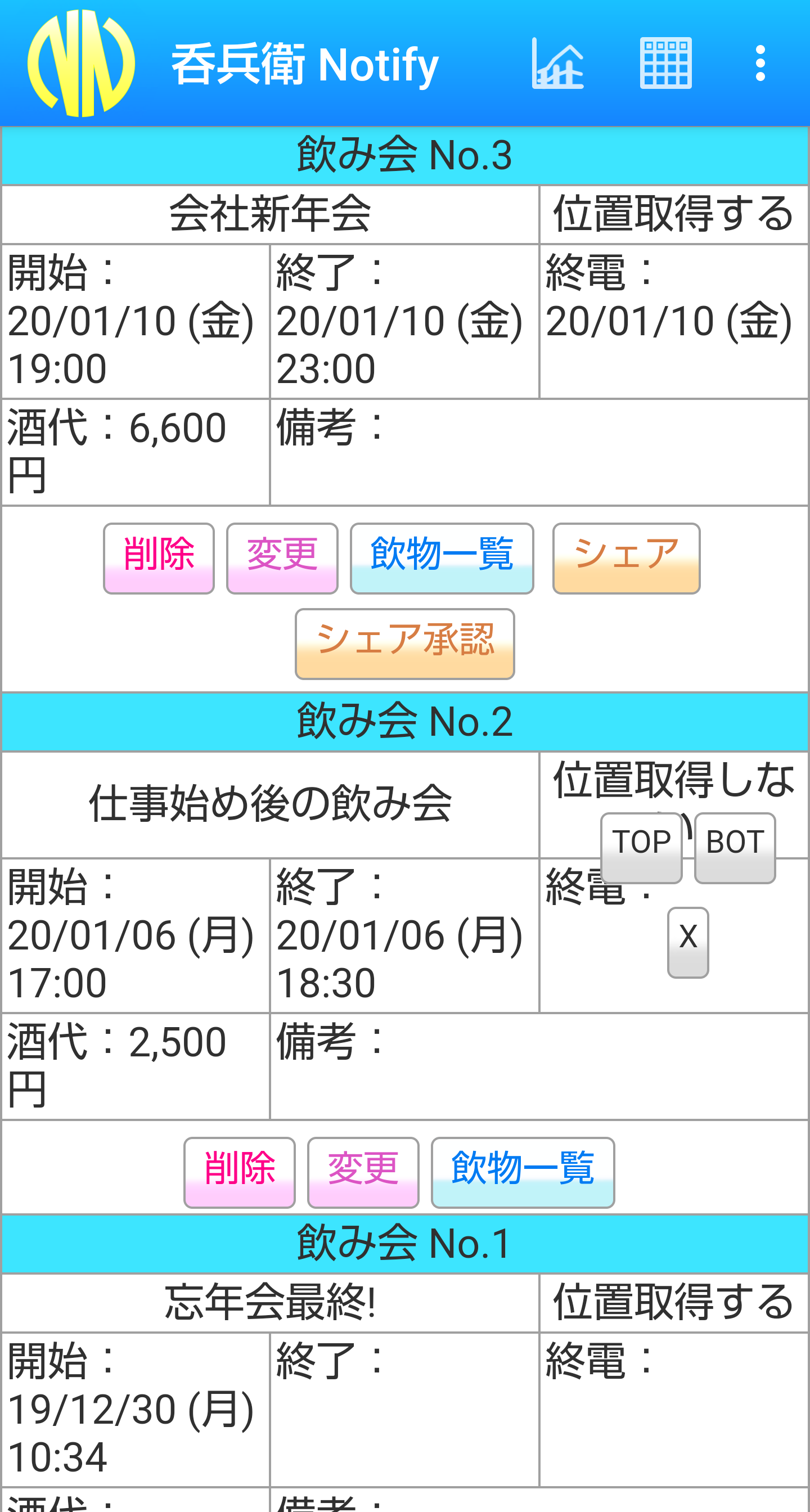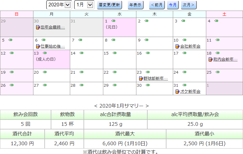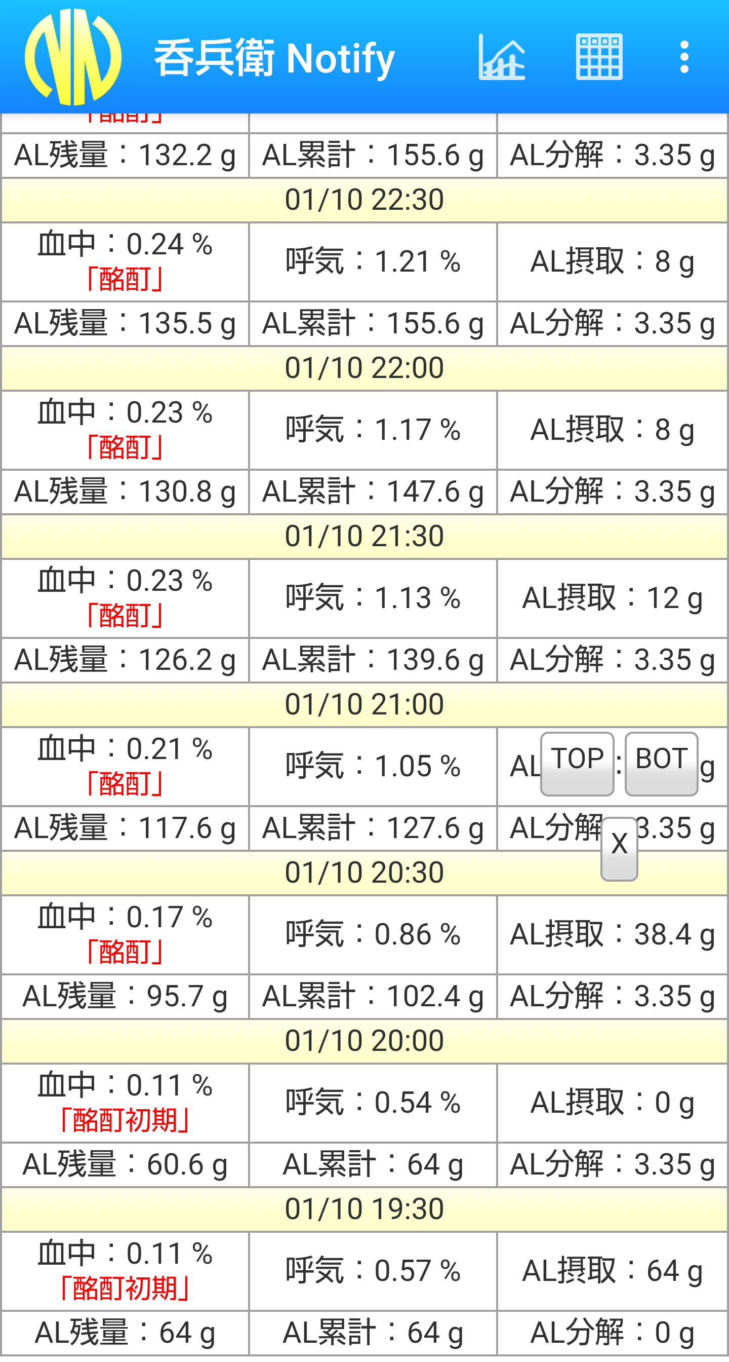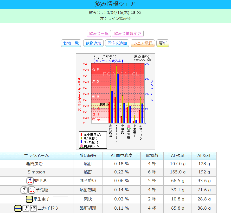 呑兵衛 Notify(のんべえノーティファイ)は、摂取するお酒を飲物ごとに登録していくことで、血中アルコール濃度がどの段階にあるかを「グラフ」や「お知らせ」で分かるようになっています。血中アルコール濃度は、飲まれる方の体重や時間の経過で濃度が変わってきます。その濃度により「ほろ酔い」や「酩酊初期」、「酩酊」などの段階があり、その段階が上がるたびにあらかじめ設定したお知らせの方法(メール)で段階のお知らせをお送りします。 また、その他のお知らせの種類として、「終電時間のお知らせ」、「血中アルコール濃度リミットのお知らせ」があります。「終電時間のお知らせ」では、終電の時間を登録しておくことで、約30分前にお知らせをお送りします。「血中アルコール濃度リミットのお知らせ」は、アルコールの濃度がリミットとして設定した値に達した場合にお知らせをお送りし、そのあとの飲物の追加をできないようにしてリミットに達したことをより分かりやすくしています。 血中アルコール濃度が同じ値であっても、人によってアルコールへの体質の違いがあったり、飲む時の体調により酔い方が違うこともあります。そういった場合や、アルコール分解のサプリを飲んだときなどには、会員情報や飲み会情報を登録する際の「アルコール体質」を変えることで、疑似的に濃度を変えてお知らせ等に適用することができます。 飲物の登録では、ショットごとに代金を支払う場合に便利なように飲物単位の酒代の登録が行えます。飲み会で最後に清算の場合は、最後に注文した飲物情報にあとでその酒代を登録できます。1次会や2次会など、清算するたびに登録しておけば、その日の飲み会の合計金額がいくらであったかが飲み会一覧で見ることができます。カレンダーでは、月単位でのサマリーが表示され、月の酒代の合計や飲み会の回数などが表示されます。 詳しくは以下をご覧ください。